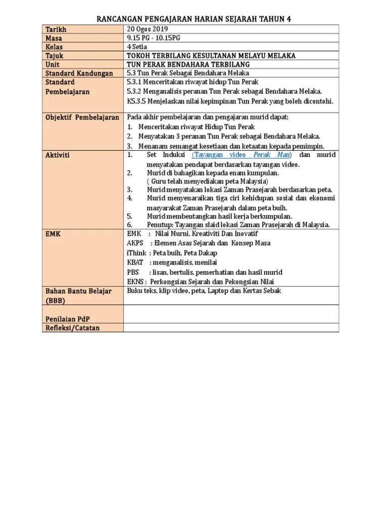 Rancangan pengajaran harian sejarah mata pelajaran dan kelas sejarah tahun 4 jujur tema/tajuk tokoh.